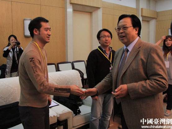 图为原中共河南省委书记徐光春与台湾媒体记者亲切握手(中国台湾网 徐维彬 摄)