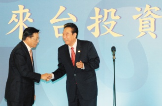 海协会和台湾海基会昨天举行陆资赴台投资座谈会,海基会董事长江丙坤(左)与海协会长陈云林(右)出席,向两岸企业喊话招商。来源:台湾《联合报》