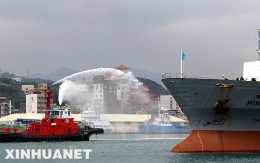 资料图片:2008年12月15日,即将远航的船舶接受喷水祝福。当日,台湾万海航运、阳明海运、台湾航业、福建华荣等4家航运公司联合举办的两岸海运直航基隆首航仪式在台湾基隆港举行。新华社记者 陈斌华摄