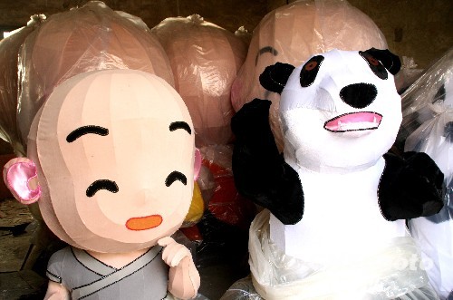 当天装箱启程的花灯为二十九盏沙弥灯和三盏大熊猫灯。其中卡通版的沙弥灯造型千姿百态,沙弥或立、或坐、或卧、或躺,有的攥佛珠,有的肩挑水桶,一招一式栩栩如生。尤其夺人眼球的是采用透光处理技术制作的小沙弥一米高“娃娃大头”,凸显俏皮活泼形象。