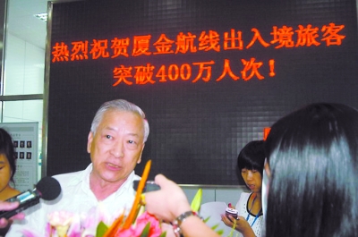 2009年7月10日,陈信仲作为厦金航线第400万名旅客正在接受媒体采访。 叶明亮 郑晓强 摄 (资料图片)