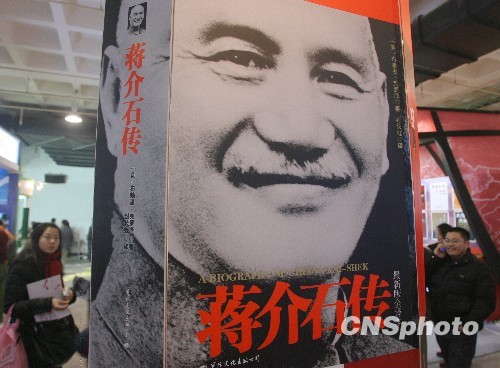 1月8日,参加北京图书订货会的读者从《蒋介石传》的海报前走过。当日,2010北京图书订货会开幕,将有1000多家图书馆参与现场采购。近年来,大陆逐渐兴起了一股“蒋介石热”,研究蒋介石的论文、书籍逐渐增多。在蒋介石的故乡浙江奉化,连他最爱吃的千层饼都卖火了一条街。有台湾媒体称,“在大陆,只要是蒋介石留下的一点一滴,现在全成了宝。” 中新社发 苏丹 摄