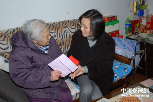 上海市妇联副主席朱鸣(右)向革命前辈张砚(左)送上新春慰问金。(上海市台联 王茜 摄)