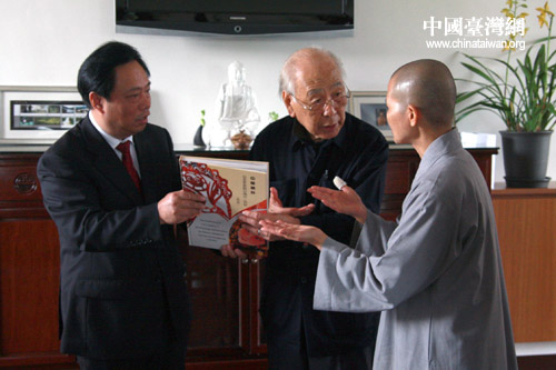 6日上午,全国台联会长梁国扬向慈济赠送100册《中国国粹油画艺术精品两岸三地展(画册)》 。(中国台湾网 田云鹏 摄)