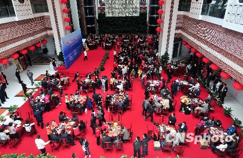 中新社泉州2月27日电 (詹托荣)27日上午,在中国闽台缘博物馆《同文、同种、同根生》的巨幅爆绘壁画下,来自德国、美国、台湾等国家和地区的上千名茶友坐在具有闽南特色的八仙茶桌前,共品福建名茶,共赏茶乡民俗表演,共话源远流长的两岸茶缘。