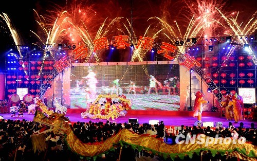 晚上8时30分许,全场灯光渐渐暗下,一道玫瑰花形光束由远及近,“双马”形状的焰火划过夜空,接着令人眼花缭乱的焰火随着音乐的节拍燃放,两岸民俗队伍开始了热热闹闹的晚会表演。