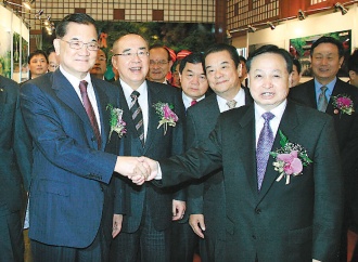 “湖北(武汉)台湾周”开幕式暨鄂台经贸文化交流与合作论坛昨天揭幕,湖北省委书记罗清泉(右二)、国民党荣誉主席连战(左一)、吴伯雄(左二)及台湾工总理事长陈武雄(右三)、远东集团董事长徐旭东(右四)等企业界领袖参与活动。图片来源:台湾《经济日报》