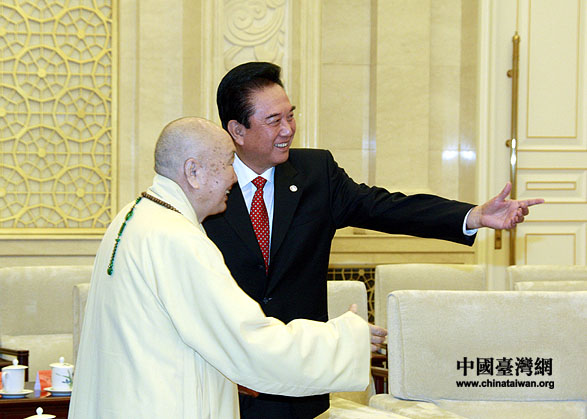 4月23日上午,陈云林在北京会见台湾中台禅寺开山方丈惟觉长老。(中国台湾网 钟宝华 摄)