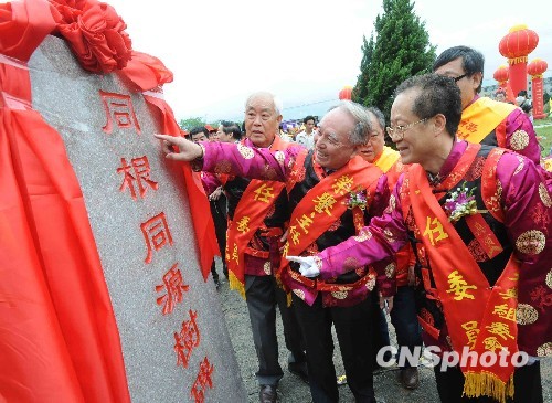 4月23日,参加第二届闽王(王审知)文化节系列活动的台湾王氏宗亲来到闽王陵广场前共植同根、同源树后喜看刚刚揭幕的同根同源树碑。当日,主题为“缅怀闽王历史功绩,促进两岸和平发展”的第二届闽王(王审知)文化节在福州市晋安区新店镇莲花山王审知陵园隆重开幕。 中新社发 刘可耕 摄