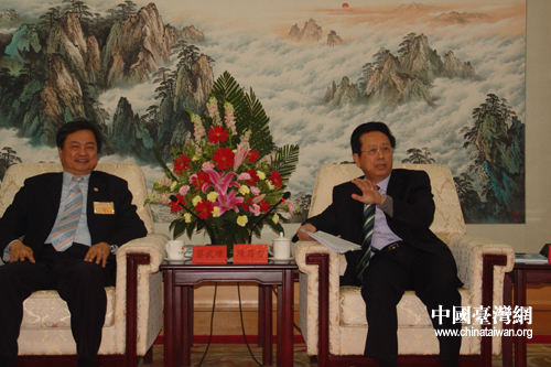 4月27日下午,中国和平统一促进会与台湾“一国两制”研究协会访问团在京座谈,全国人大常委会副委员长、中国和平统一促进会副会长陈昌智(右)出席并发表讲话。(中国台湾网 杨丽 摄)