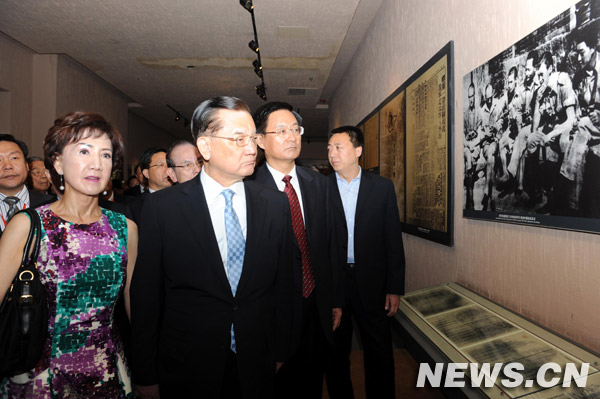 5月4日,连战(左二)和夫人连方瑀参观台儿庄大战纪念馆珍藏的“台儿庄战役”历史照片。当日,中国国民党荣誉主席连战和夫人连方瑀在山东枣庄参加海峡两岸交流基地标志性建筑--泰和楼的奠基仪式,并参观了台儿庄大战纪念馆、运河古城等台儿庄名胜古迹。新华社记者 范长国 摄
