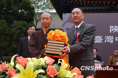 惟觉长老此次是专程来此间出席碑石拓本赠送仪式的。从2009年底开始,西安碑林博物馆对碑林藏石进行拓印,共向台湾中台禅寺赠送藏石拓本528种、墓志拓本745种。囊括了该馆珍藏的历代著名碑刻,涉及历史、经济、文化、宗教、军事、艺术、地理等诸多领域。其数目之多、级别之高,均创碑林建馆史上的赠品之最。