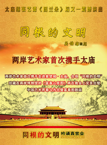 5月15日晚,紫禁城太庙继张艺谋《图兰朵》后即将上演又一震撼文化演出——《同根的文明》吟诵真赏会。两岸艺术家首次携手走进太庙,合颂《同根的文明》,珍藏在两岸博物馆的《富春山居图》将在演出中实现完美合璧,中国艺术家泰斗为合璧后的《富春山居图》题跋。