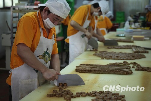 贡糖与钢刀、金酒并称为金门的三大伴手礼,备受来到金门旅游的大陆游客青睐。图为金门的贡糖制作师傅正在切“猪脚糖”。 中新社发 罗钦文 摄