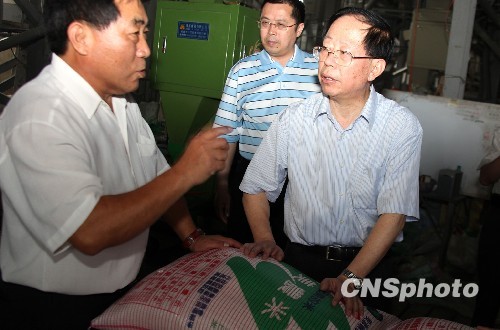 5月24日,海峡两岸农业交流协会名誉会长危朝安结束为期6天的台湾“乡村之旅”,搭机自高雄小港机场离台,他向中新社记者表示,此次走访台湾北、中、南,探农情、询合作、盼多赢,收获良多。图为危朝安(右)探访高雄县美浓镇一家“美农米”碾米厂。 中新社发 董会峰 摄