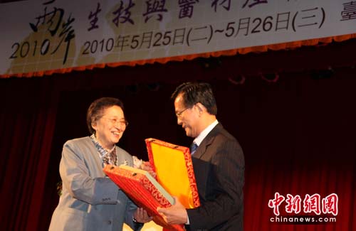 5月25日,前全国人大常委会副委员长、海峡两岸医药卫生交流协会名誉会长何鲁丽,在台北出席“两岸生技与医材产业合作及交流会议”。图为何鲁丽与台湾方面代表互赠纪念品。记者 董会峰 摄