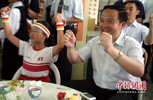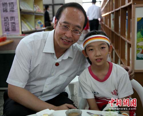 图为汶川地震重灾区中共绵阳市委书记吴靖平与埔里小学生亲切交谈。 作者:邹辉