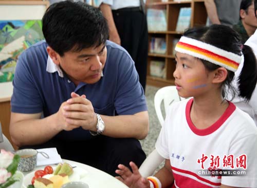 图为汶川地震重灾区中共广元市委书记罗强与埔里小学生亲切交谈。 作者:邹辉