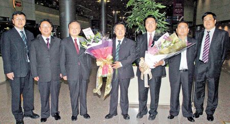 刘永忠(中)2日下午率经贸团赴台访问,台湾旺旺集团总监王仁铨(左三)等人到桃园机场接机。图片来源:《中国时报》