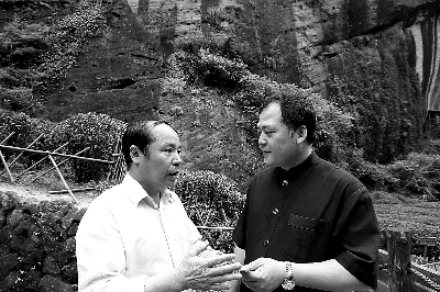 6月3日,台湾阿里山茶叶合作社理事会主席王昭坤(右)到武夷山考察茶叶种植。王昭坤说,台湾的冻顶乌龙茶来自武夷岩茶——大红袍,武夷岩茶——大红袍与阿里山冻顶乌龙都发自武夷山。 邱汝泉 摄