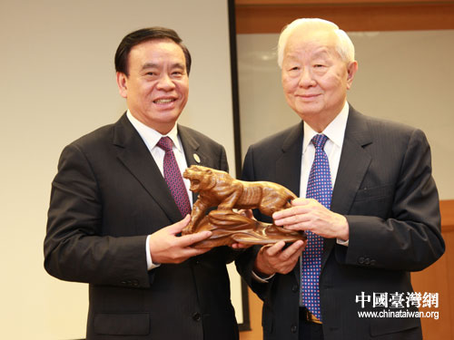 吕祖善赠送东阳老虎木雕给台积电董事长张忠谋。(浙江省台办 王健 摄)