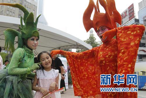 6月15日,两位行为艺术家和一位小姑娘互动。当日,“两岸城市艺术节——台北文化周”在上海南京东路世纪广场开幕,来自台北的十多位街头行为艺术家为上海市民送上了街头行为艺术表演。新华社记者裴鑫摄