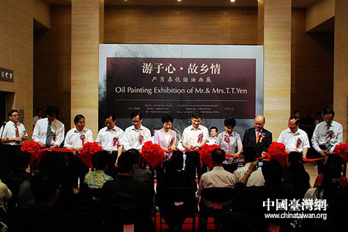 与会嘉宾为“游子心·故乡情——严隽泰伉俪北京油画展”活动剪彩 。(中国台湾网 刘莹 摄)