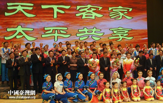 参加第四届海峡两岸客家高峰论坛的嘉宾与演职人员合影。(中国台湾网 张弛 摄)