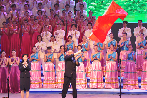 在闭幕式上,中共福州市委常委、副市长、宣传部长朱华向台湾新竹市副市长曾国修递交了海峡两岸合唱节的会旗,第四届海峡两岸合唱节明年将在台湾新竹举行。(记者 包杰)