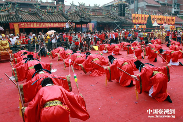 上午8点30分,鼓乐喧天,祭典仪式正式开始,身着祭奠服饰的司仪率领来自两岸的关帝信众,严格遵照古代祭拜关帝的程式,献太牢、献爵、献肴、行祭拜礼,祭拜关公、文舞武舞告祭,表达崇敬之情。