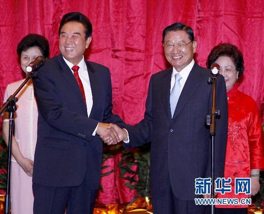 6月28日,由江丙坤董事长率领的海基会协商代表团一行抵达下榻的重庆申基索菲特大酒店,受到海协会会长陈云林的热情欢迎。这是陈云林(前左)和江丙坤(前右)在欢迎仪式上握手。新华社记者陈建力摄