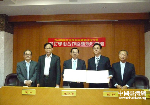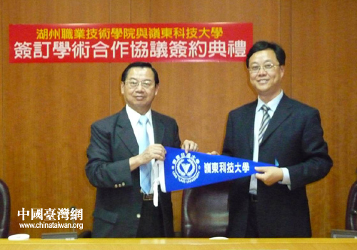 中国台湾网7月2日湖州消息 日前,台湾岭东科技大学校长陈振贵与湖州职业技术学院院长胡世明签订合作协议,两校正式结为姊妹学校。湖州职业技术学院的22名女生应陈校长的邀请,将于2010年9月13日至2011年1月14日期间赴台湾进行交流学习。期间,将在台湾岭东科技大学选修18-20学分的课程进行学习。