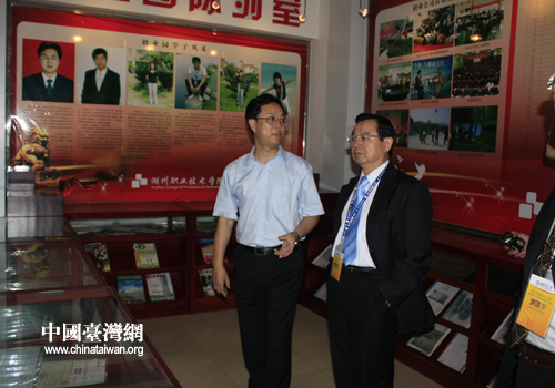 台湾岭东科技大学考察团参观湖州职业技术学院创业园陈列室(图片来源:湖州市台办)