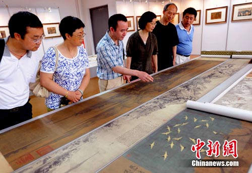 7月8日,观众在福州举办的“两岸故宫高仿真宫廷画联展”上被展出的一幅合璧版仿真《富春山居图》所深深吸引。《富春山居图》是元朝画家黄公望的代表作,是其为无用师和尚所绘,以浙江富春江为背景,全图用墨淡雅,山和水的布置疏密得当,墨色浓淡干湿并用,极富变化,被誉为中国十大传世名画之一,其流传经历充满传奇色彩,目前两岸各存一段。据了解,此次“两岸故宫高仿真宫廷画联展”共展出130余件高仿真作品,囊括了隋唐五代、宋、元、明、清和近代各个时期书画名家的传世佳作。