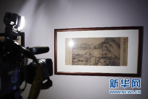 7月29日,电视记者在发布会举行前拍摄《剩山图》的复制品。当日,台北故宫博物院院长周功鑫在此间宣布,台北故宫将于2011年6月至9月推出“山水合璧——黄公望与富春山居图特展”,重现元代画家黄公望旷世杰作《富春山居图》的原貌。 新华社记者 费茂华 摄