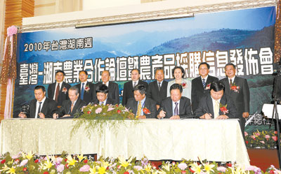 8月6日上午,在台南走马濑农场举行了“台湾-湖南农业合作论坛暨农产品采购信息发布会”。湘台农业界人士200余人参加了洽谈会。台湾海峡两岸农业协会与湖南省农业产业协会签订了“湘台农业合作备忘录”;湘台相关企业签订了“台湾茶叶采购意向书”、“台湾水产品、水果等农产品采购合作意向书”、“台湾食品采购合同”、在湖南各大超市设立“苗栗县卓兰镇水果专柜”合作意向;湖南省供销合作社发布了农产品采购信息。两地农业界表示将携手合作,取长补短,推动两地农业共同发展。