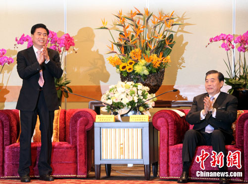8月16日,广东省省长黄华华(左)率团到台北参加“台湾·广东周”活动。他在与台北世贸中心董事长王志刚(右)及台湾工商企业界人士会面时强调,广东的发展与台湾同胞的大力支持分不开。中新社发 刘舒凌 摄