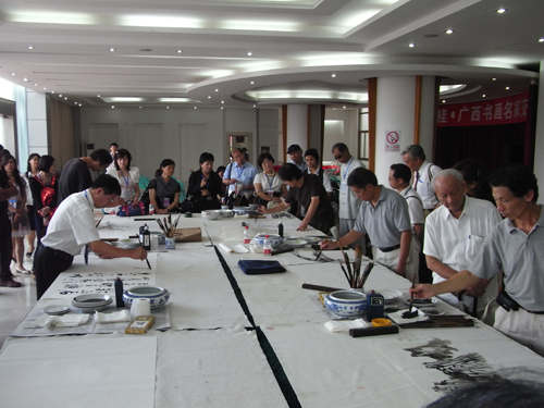 中国台湾网8月17日南宁消息 8月16日,“情系八桂——两岸文化联谊行”大型文化交流活动走进广西,这一天也恰巧正逢中华民族共同的“七夕”。两岸文化界知名人士走进邕江畔的邕江湾美术馆,进行了一场别开生面的交流笔会。