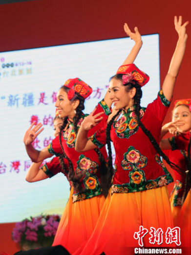 8月14日,来自新疆的少数民族舞者在第五届海峡两岸台北旅展上带来精彩的民族舞蹈。大陆31个省区市和新疆生产建设兵团的旅游协会组成约1200人的团队来台,并首度展销合一、面向台湾民众推介旅游产品。中新社发 刘舒凌 摄