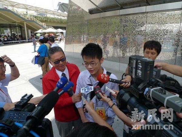 李敖和儿子李戡在台湾馆前接受采访。(图片来源:新民网)
