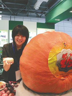 19日,在江苏台湾周(昆山)农业合作洽谈会上,江宁台湾农民创业园种出的特大南瓜、特小南瓜令观者称奇。
