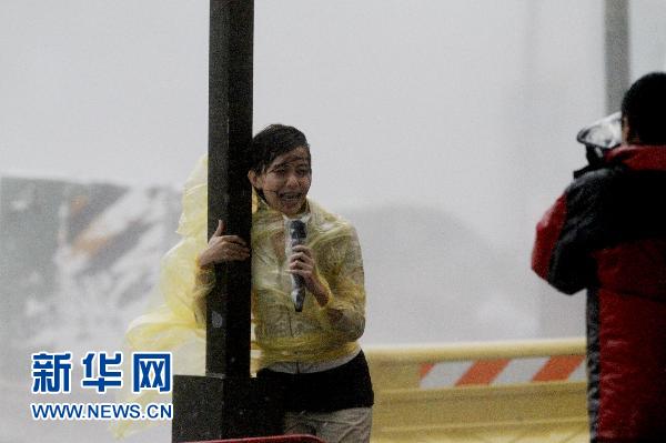 9月19日,受台风影响,高雄市区风强雨大,一名电视台记者抱着柱子在台风现场报道。 新华社发