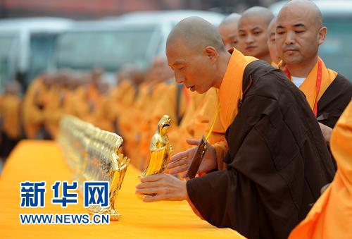 9月27日,在舟山定海老塘山码头,一名僧人捧起南海观音圣像准备登上游轮。新华社记者 王定昶 摄