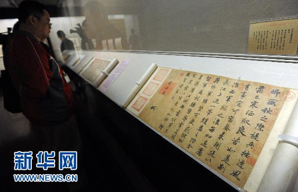 10月7日,参观者在台北故宫博物院观看展品。“文艺绍兴——南宋艺术与文化特展”将于10月8日至12月26日在台北故宫博物院举行,展出来自两岸及日本十余个博物馆的大量南宋时期珍贵文物和文献资料,全方位展现南宋在文化与艺术方面的成就。新华社发(吴景腾 摄)