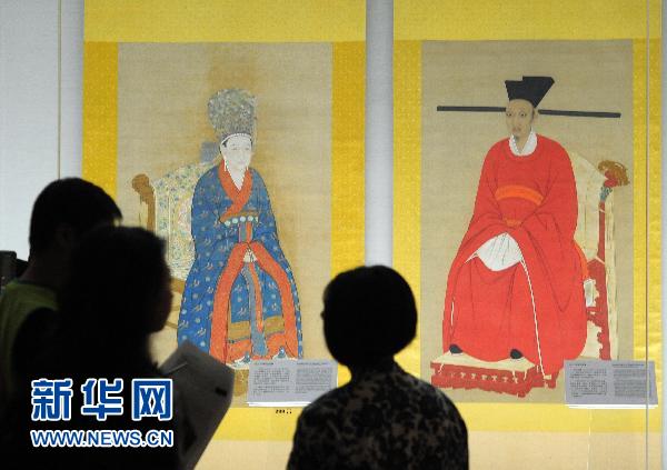 10月7日,参观者在台北故宫博物院欣赏《宋宁宗坐像》(右)与《宋宁宗后坐像》。新华社发(吴景腾 摄)