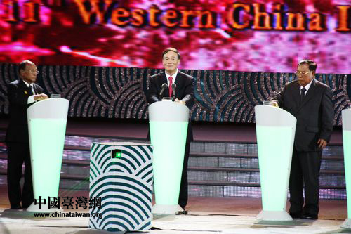 10月22日,第十一届中国西部国际博览会在成都开幕。图为中共中央政治局委员、国务院副总理王岐山(中)等嘉宾宣布西博会正式开幕。(中国台湾网 马迪 摄)