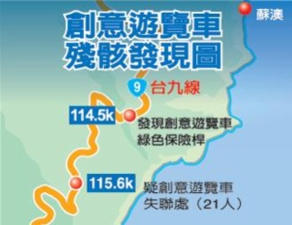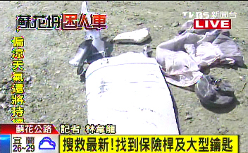 苏花公路发现疑似失踪大陆游客所乘游览车前方保险杆、插着钥匙的油箱盖、小孩洋装和防火板。 来源:台湾TVBS电视台