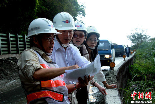 10月25日,海峡两岸旅游交流协会台北办事处主任范贵山(左2)、海峡两岸旅游交流协会副秘书长李亚莹(左3)等,来到发生大面积塌方的台湾苏花公路114.5公里现场,了解救援进展。中新社记者王健 摄