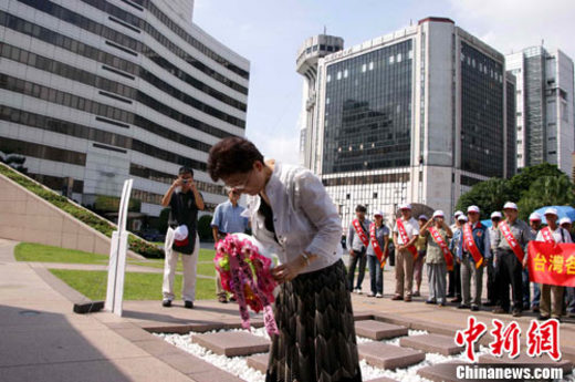10月25日,台湾民间团体中国统一联盟与各界代表约百人,在台北中山堂“抗日战争胜利暨台湾光复纪念碑”前,举行庆祝台湾光复65周年活动,藉此对英勇抗日志士表达敬意与追思。 中新社记者 陈立宇 摄