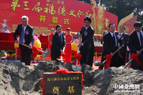 现场的嘉宾为福德文化墙奠基仪式培土。(中国台湾网 董洁 摄)